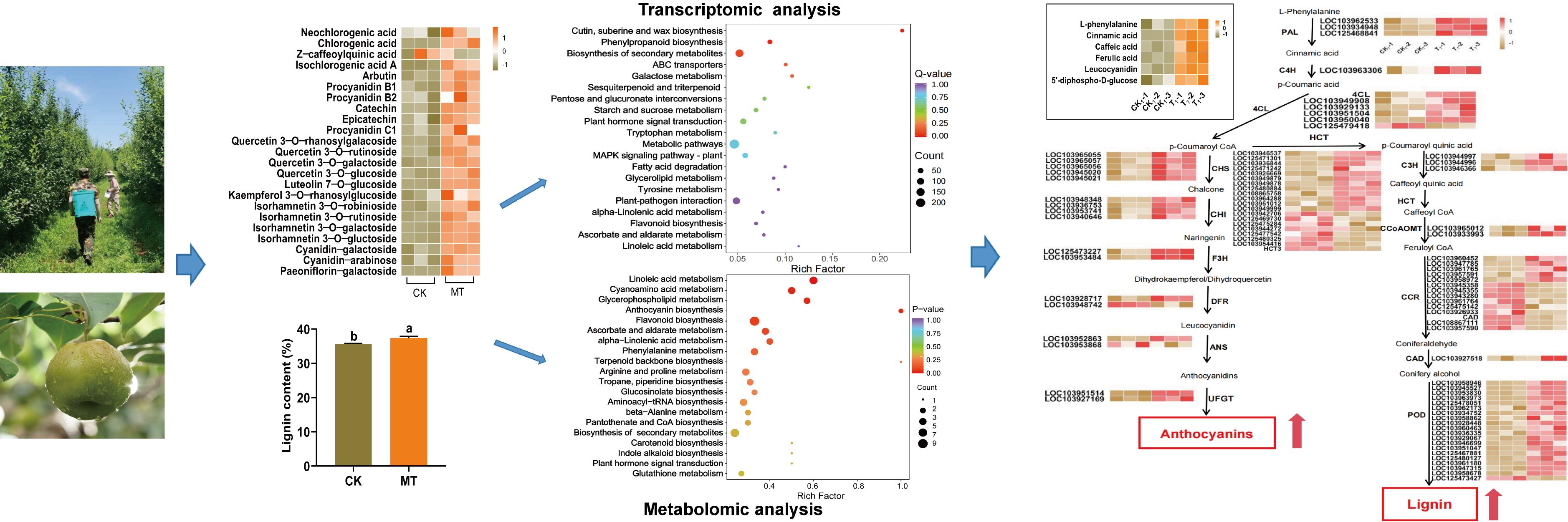 酚类物质作为梨果实中的重要次生代谢产物,与果实的外观、风味紧密相关。前期研究表明采前喷施褪黑素可以显著影响果皮中酚类物质的含量,但其调控机制仍不清晰。本研究利用生理生化、转录组和代谢组多学科综合研究方法,阐明了褪黑素通过影响 PAL/4CL/CHS/COMT 等酚类合成关键基因表达,并增加L-苯丙氨酸、肉桂酸、咖啡酸、等关键代谢物含量来促进梨果皮中花青苷、酚酸和木质素的生物合成机制。同时,初步筛选出了褪黑素参与调控多酚生物合成的关键转录因子。这些发现为深入理解褪黑素调控梨果皮酚类化合物合成机制提供了全面视角,为进一步精准调控梨果实酚类物质合成奠定了坚实基础。