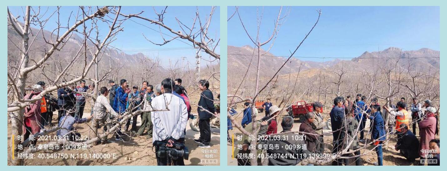 2021年3月31日,果树所党委副书记李建才、康国栋研究员、赵德英研究员一行前往河北省秦皇岛市青龙满族自治县开展技术指导。青龙县委常委、县委办公室主任张德龙,农业农村局局长高俊文,大石岭乡党委书记刘鹏程和秦皇岛市农业农村局孙延斌科长等全程陪同。