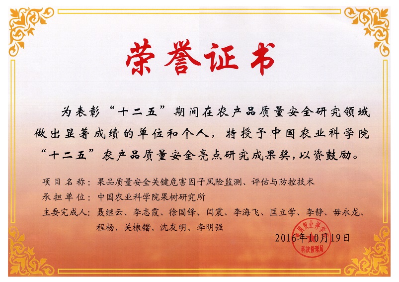 果品质量安全课题组以质量安全检测与溯源技术、质量安全风险评估与控制、营养品质评价与功能发掘为主要研究方向,重点开展质量安全风险评估、质量安全检测技术、果品溯源技术、质量安全标准、营养品质评价等方面的研究。
